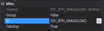<Button Control์ ์ถ๊ฐํ ๋ชจ์ต>ID๋ IDC_BTN_IMAGELOAD๋ผ๊ณ ์ค์ ํ์ต๋๋ค.