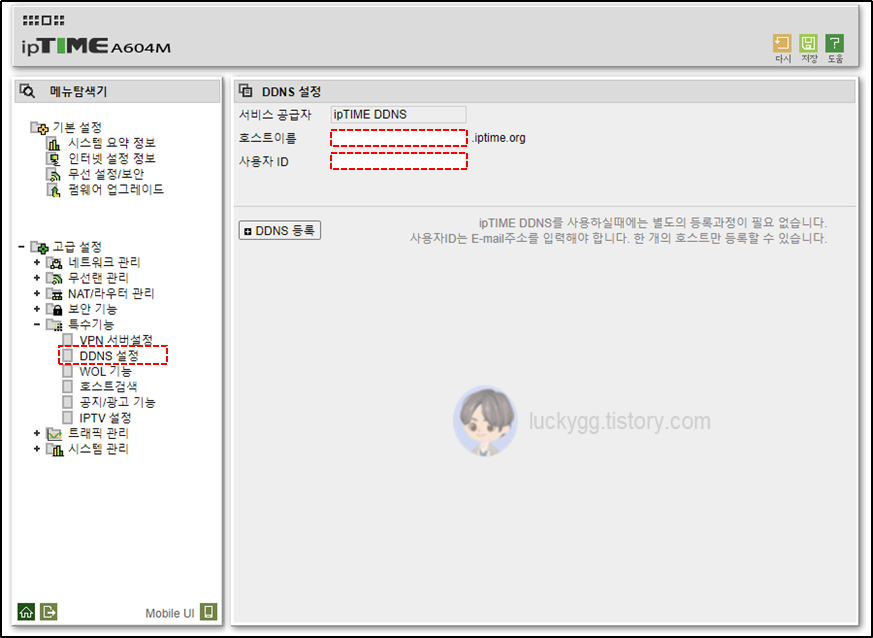 ๊ณ ๊ธ ์ค์ > ํน์ ๊ธฐ๋ฅ > DDNS ์ค์ ๋ฉ๋ด๋ฅผ ํด๋ฆญํฉ๋๋ค.