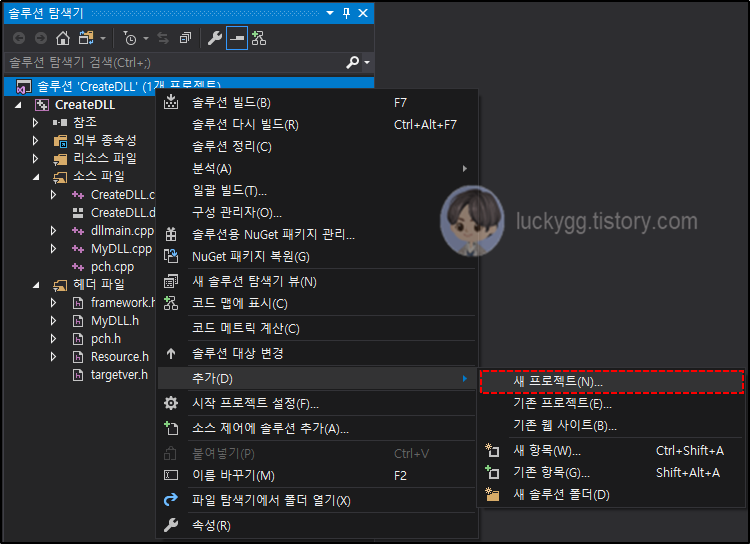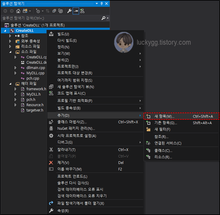 ํ๋ก์ ํธ์ ์ ํญ๋ชฉ์ ์ ํํ์ฌ MyDLL.h์ MyDLL.cpp๋ฅผ ์ถ๊ฐํฉ๋๋ค.