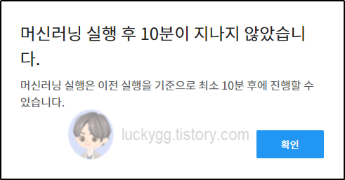 ์ฐธ๊ณ ๋ก ๋ธ๋ก์ ์์ , ํ์ตํ๊ธฐ ์ํด ๋จธ์ ๋ฌ๋ ์คํ ๋ฒํผ์ ํด๋ฆญํด์ผ ํ๋๋ฐ์. ์ด ํ์ต์ ์ต์ 10๋ถ์ ๊ฐ๊ฒฉ์ด ํ์ํฉ๋๋ค. ์ฆ, ์ฒ ์ ํ ์ค๋นํ์ง ์๊ณ ๋น๋ฒํ๊ฒ ์์ ํ ๊ฒฝ์ฐ, ๋ค์ ํ์ต๊น์ง 10๋ถ์ ๊ธฐ๋ค๋ ค์ผ ํฉ๋๋ค.