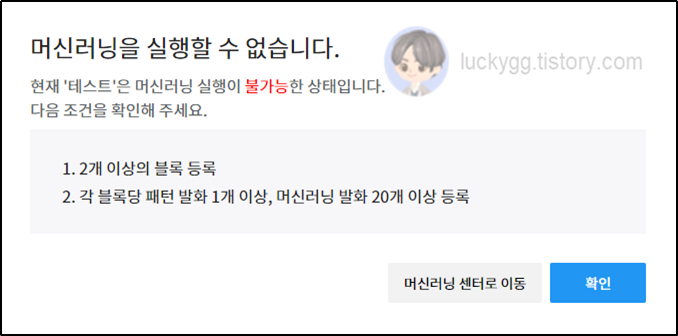 ์ฐธ๊ณ ๋ก ๊ธฐ๋ณธ ์๋๋ฆฌ์ค์ ๋ธ๋ก๋ง ์กด์ฌํ ๊ฒฝ์ฐ ์๋์ ๊ฐ์ ๋ฉ์์ง๊ฐ ํ์๋์ด ํ์ต์ด ์งํ๋์ง ์์ต๋๋ค. ์ข ๋ ๋ง์ ๋ธ๋ก์ ์์ฑํ ํ ํ์ต์ ์งํํ์๊ธฐ ๋ฐ๋๋๋ค.