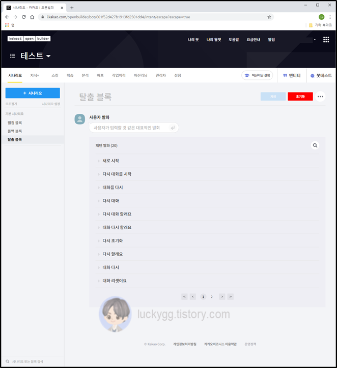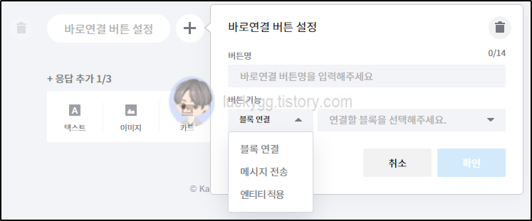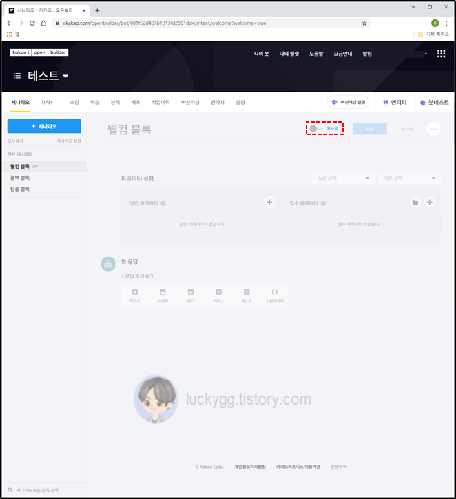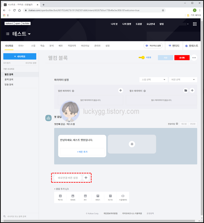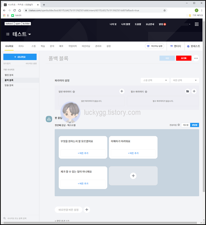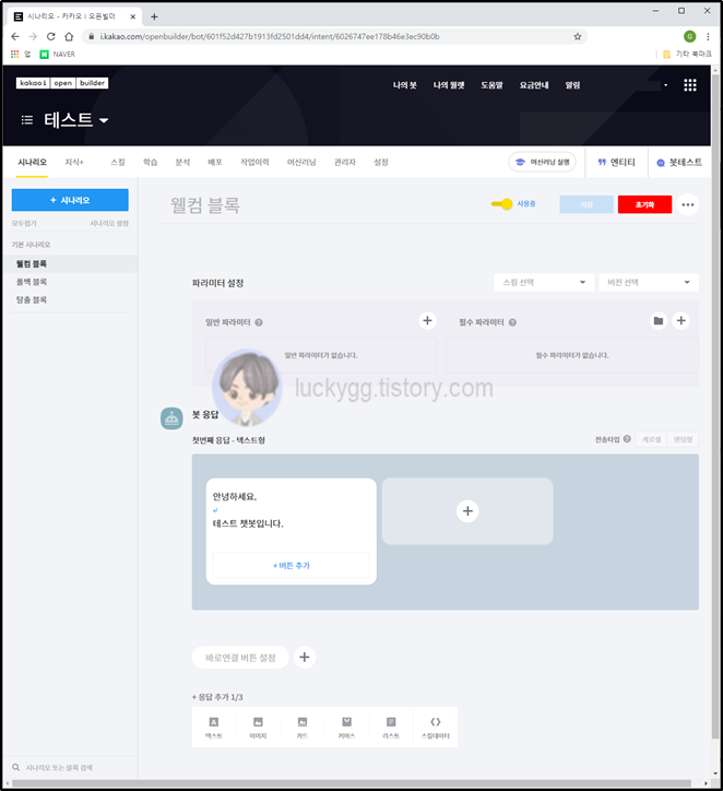 ์ฐธ๊ณ ๋ก, ์๋๋ฆฌ์ค ๋ฐ ๋ธ๋ก์ ๋ฏธ๋ฆฌ ์ฒ ์ ํ๊ฒ ์ค๊ณ๋ฅผ ํ๊ณ ์งํํด์ผ ํฉ๋๋ค. ์ฑ๋ด์ ์ปจ์ ๊ณผ ์ฌ์ฉ์์ ์์ ๋ฐํ ๊ทธ๋ฆฌ๊ณ ๋ฐํ์ ๋ฐ๋ฅธ ์๋ต ๋ฑ์ ์ค๊ณํด์ผ ํ๋ค๋ ์๋ฏธ์ ๋๋ค.