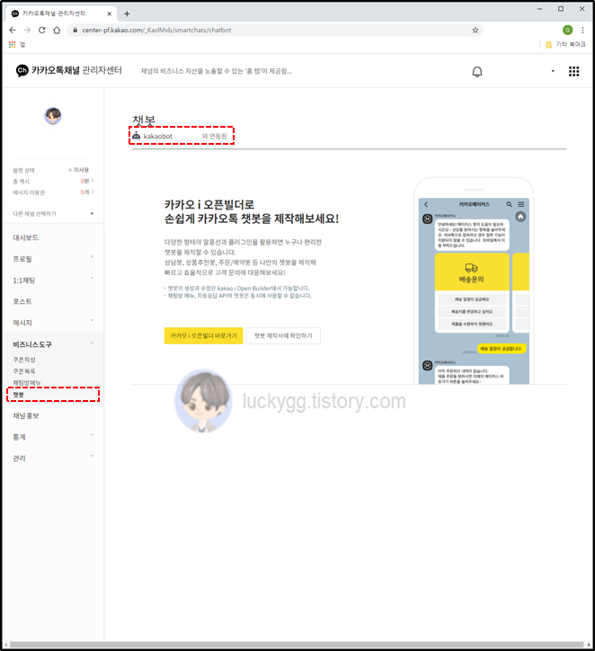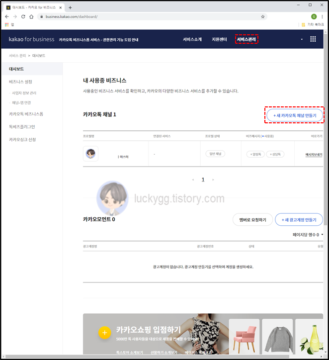 ์ฐ์ธก ์๋จ์ ์๋น์ค ๊ด๋ฆฌ๋ฉ๋ด๋ฅผ ํด๋ฆญํ๊ณ , ์ ์นด์นด์คํก ์ฑ๋ ๋ง๋ค๊ธฐ๋ฅผ ํด๋ฆญํฉ๋๋ค.