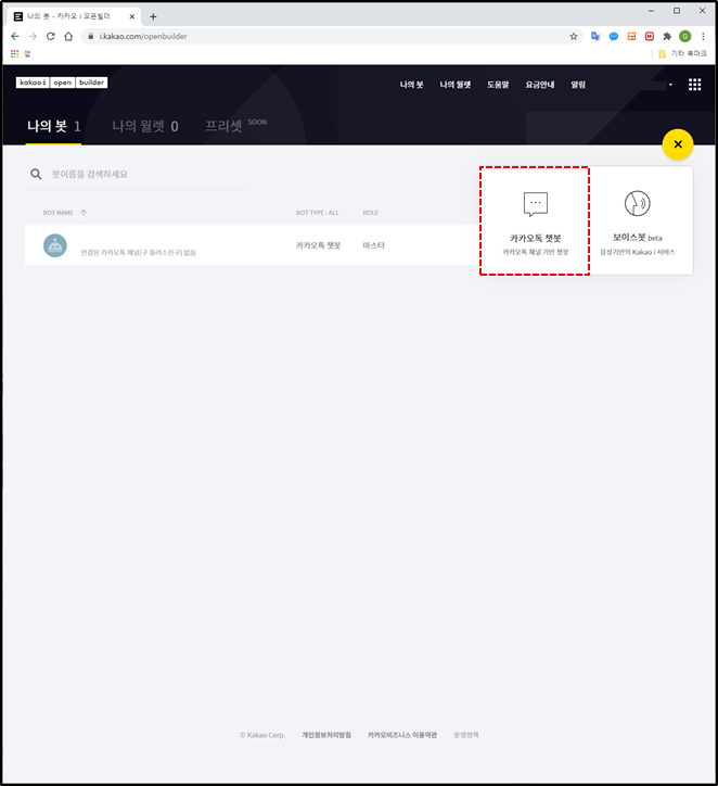 ์นด์นด์คํก ์ฑ๋ ์๋น์ค์ ์ฐ๋ํ๊ธฐ ์ํ ์ฑ๋ด์ ๋ง๋ค๊ธฐ ์ํด์๋ ์นด์นด์ค i ์คํ๋น๋ ์๋น์ค์ ๊ฐ์ ๋ฐ OBT ์ ์ฒญ์ ํด์ผ ํฉ๋๋ค.