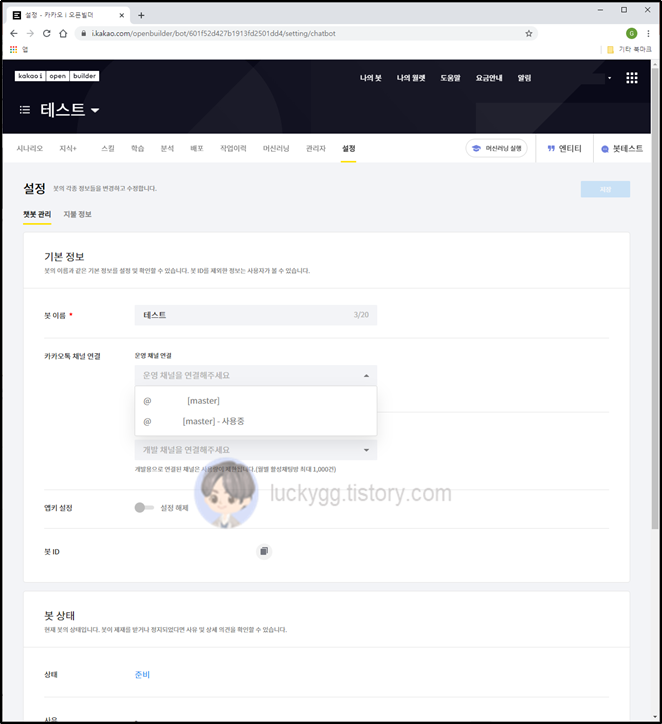 ์นด์นด์คํก ์ฑ๋ ์ฐ๊ฒฐ์์ ์ด์ ๋๋ ๊ฐ๋ฐ ์ฑ๋์ ์ ํํ๊ณ ์ ์ฅ ๋ฒํผ์ ํด๋ฆญํ๋ฉด ์ฐ๋์ด ๋๋ฉ๋๋ค.