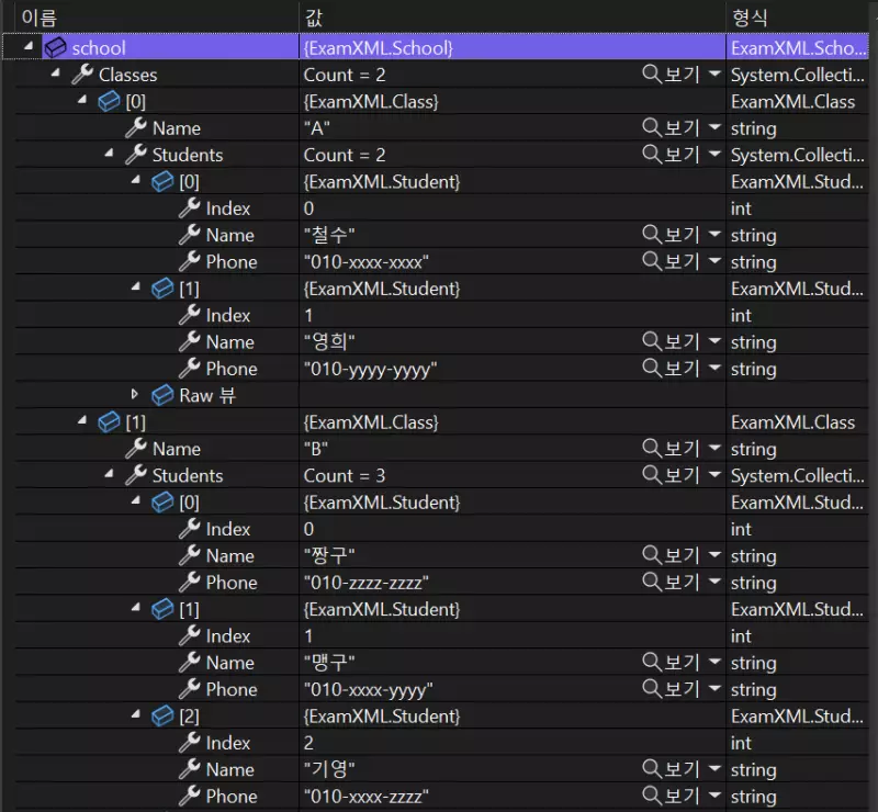 new Student { Index = 1, Name = "์ํฌ", Phone = "010-yyyy-yyyy" }