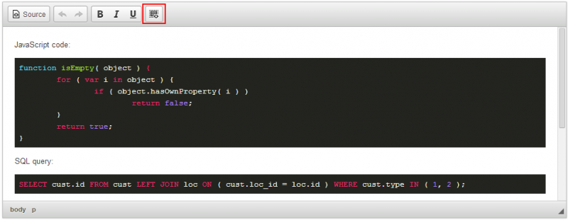 CKEditor์ Codesnippet ํ๋ฌ๊ทธ์ธ์ ์๋ํฐ์ ์์ฑํ ์ฝ๋ ๋ธ๋ก์ ๋ณด๊ธฐ ์ข๊ฒ ํ์ํด ์ฃผ๋ ํ๋ฌ๊ทธ์ธ์ผ๋ก, ๋ค์ํ ํ๋ก๊ทธ๋๋ฐ ์ธ์ด์ ๋ฌธ๋ฒ ํ์ด๋ผ์ดํ ์ ์ง์ํฉ๋๋ค. ๋ณ๊ฑฐ ์๋ ์๋ ์์ง๋ง, ๋จ์ํ ํ ์คํธ ํ์์ ์ฝ๋๊ฐ ์๋, ๊ฐ๋ ์ฑ์ด ๋๊ณ ๊ตฌ์กฐ์ ์ผ๋ก ๊ตฌ๋ถ๋ ์ฝ๋๋ก ๋ณด์ฌ์ค ์ ์์ด ์ฝ๋ ์ฌ๋์ผ๋ก ํ์ฌ๊ธ ์ ๋ฌธ์ฑ๊ณผ ํธ์์ฑ์ ์ ๊ณตํ ์ ์์ต๋๋ค.